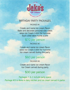 Host your next kids birthday party at The Cooking School with Jake’s Ice Cream! We have three packages, from which to choose… Email us at info@jakesicecream.com to schedule yours today!